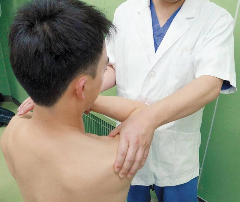 患者肩关节前屈90°,强制向内侧旋转肩关节诱发疼痛,即为阳性(图2)。