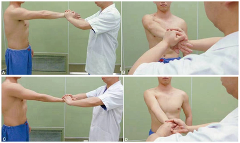 包括两个部分,一为患者在肩胛骨平面保持手臂内旋,做肩关节被动上举动作的过程中诱发疼痛;二为将手臂外旋,然后做被动上举动作,则不能诱发疼痛或者疼痛减轻。同时符合上述两部分表现即为Neer试验阳性(图1)。
