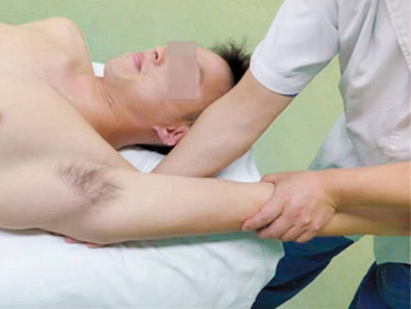 患者仰卧位,全身放松,检查者抓住患者手臂,肩外展约20°,肘部屈曲,然后通过推动肘部,推动或者压缩关节盂中的肱骨头,同时检查者另一只手向内侧和外侧旋转肱骨。此时若能感觉到撕裂的上方盂唇被挤压出现弹响或引出肩关节疼痛为阳性(图15)。