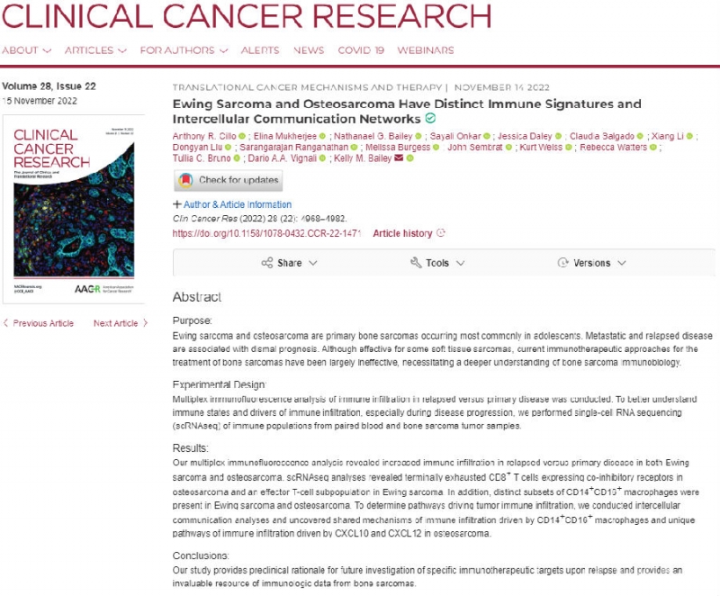 Anthony R Cillo等人发表的《Ewing Sarcoma and Osteosarcoma Have Distinct Immune Signatures and Intercellular Communication Networks》,对患者的血液和骨肉瘤肿瘤样本进行了单细胞RNA测序(scRNAseq)。在尤文肉瘤和骨肉瘤中,复发肿瘤与原发相比,其免疫浸润增加。单细胞RNA测序分析显示CD8+T细胞分别在骨肉瘤中表达共抑制受体以及尤文肉瘤中表达效应T细胞亚群。此外,尤文肉瘤和骨肉瘤中存在不同的CD14+CD16+巨噬细胞亚群。该研究为复发后的特定免疫治疗靶点提供了临床前依据,并提供了骨肉瘤免疫学数据的宝贵资源。