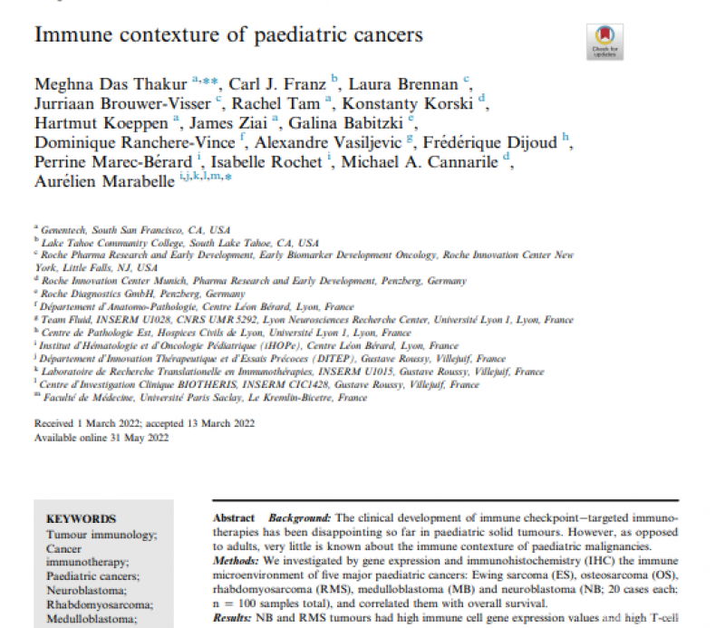 Meghna Das Thakur等人发表的《Immune contexture of pediatric cancers》运用基因表达和免疫组织化学(IHC)研究了五种主要儿科癌症的免疫微环境:尤文肉瘤(ES)、骨肉瘤(OS)、横纹肌肉瘤(RMS)、髓母细胞瘤(MB)和神经母细胞瘤(NB;各20例;n=总共100个样本),描述了这五种主要儿童癌症中免疫细胞的质量和数量,并提供了一些将这些肿瘤与成人肿瘤类型区分开来的关键特征。NB和RMS肿瘤具有较高的免疫细胞基因表达值和较高的T细胞计数,但抗原处理细胞(APC)基因表达弱。OS和ES肿瘤T细胞数量少,但APC基因表达水平高。OS具有最高的巨噬细胞(CSF1R、CD163和CD68)计数,而ES的巨噬细胞水平最低。