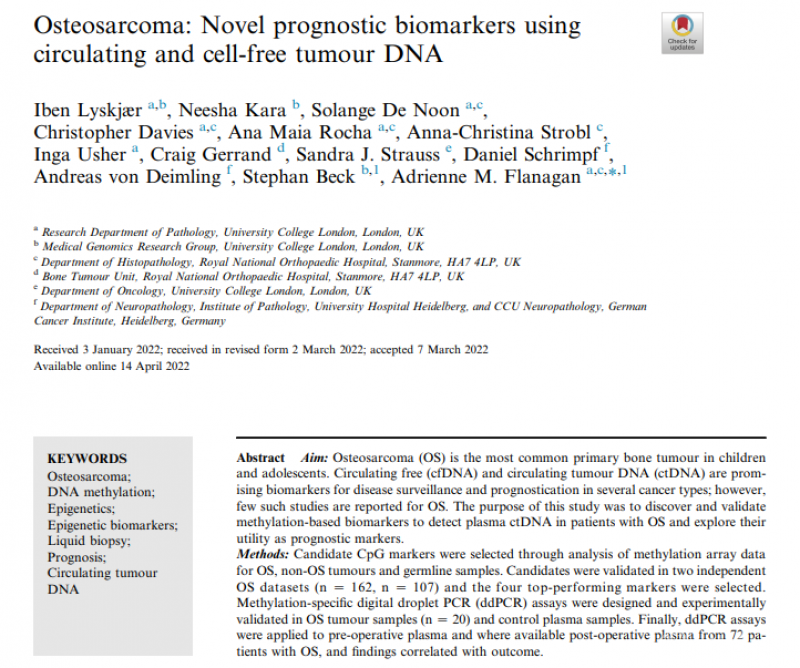 Iben Lyskjær等人发表的《Osteosarcoma:Novel prognostic biomarkers using circulating and cell-free tumour DNA》通过分析OS的甲基化阵列数据选择候选CpG标记物,发现和验证基于甲基化的生物标志物,以检测骨肉瘤患者的血浆ctDNA,并探索其作为预后标志物的作用。该研究说明基于突变非依赖性甲基化的ctDNA测定骨肉瘤存在应用潜力,为探索血浆衍生生物标志物在OS管理中的应用奠定了基础。