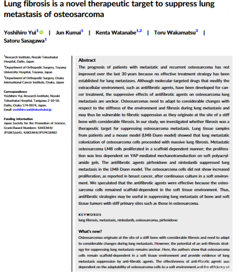 Yoshihiro Yui等人发表了《Lung fibrosis is a novel therapeutic target to suppress lung metastasis of osteosarcoma》来自患者的肺组织样本和小鼠模型(LM8-Dunn模型)显示,骨肉瘤细胞的肺转移定植导致大量肺纤维化,抗纤维化药物吡非尼酮和尼达尼布抑制了LM8-Dunn模型中的肺转移。抗纤维化策略可能有助于抑制原发部位的骨和软组织肿瘤(如骨肉瘤中的原发部位)的肺转移。