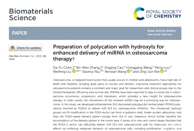 北京积水潭医院和北京市创伤骨科研究所团队研究表明miR-223可以通过抑制CDH6表达,抑制骨肉瘤的转移和进展。但由于核酸在体内易被降解清除,且与细胞膜电性相同,无法直接用于骨肉瘤治疗。该团队设计制备了富含羟基的阳离子基因载体PGEA。系列体内外实验研究表明基于PGEA阳离子基因载体的miR-223递送技术可以有效的将核酸递送至肿瘤位置并表现出显著的抑瘤效果,且不会引起明显的毒性。基于PGEA的miR-223基因传递系统也为骨肉瘤基因治疗提供了一个的新策略。