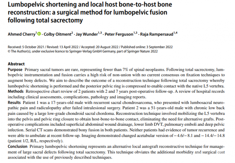 Ahmed Cherry等人发表的《Lumbopelvic shortening and local host bone-to-host bone reconstruction:a surgical method for lumbopelvic fusion following total sacrectomy》描述了全骶骨切除术后腰骶融合重建技术,用于治疗全骶骨切除术后的大骶骨缺损。