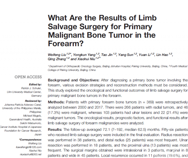 北京积水潭医院骨肿瘤团队,依靠优势的病例资源和长期随访证据,总结了近20年的前臂原发恶性骨肿瘤外科手术切除重建方法,统计分析出预后相关危险因素。为术前评估肿瘤切除安全边界、重建方式优劣提供了科学依据。该研究作为截止目前最大宗的前臂原发恶性骨肿瘤数据,为保肢治疗提供了安全切除评估要点、重建术式选择策略。为此类罕见肿瘤患者治疗提供了重要参考。