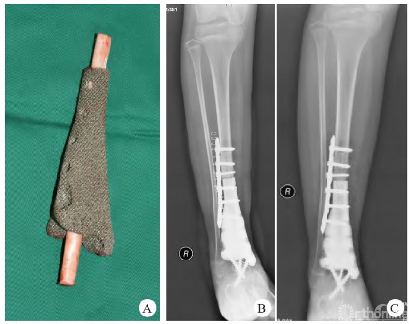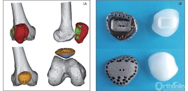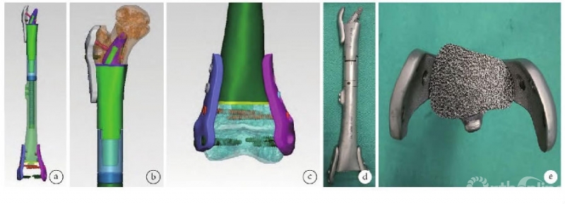 北京大学人民医院团队[3]应用3D打印金属假体重建四肢骨肿瘤切除术后大段骨关节缺损,弥补了传统生产工艺及手术技术的缺陷,为四肢大段骨缺损的重建提供了新思路,其团队应用3D打印定制肱骨远端半肘关节假体重建肘关节恶性肿瘤切除术后骨缺损。MSTS93评分为19~28分,平均24.1分;获优8例,良2例。VAS评分为(0.9±1.0)分,较术前(5.9±1.0)分明显改善,差异有统计学意义。