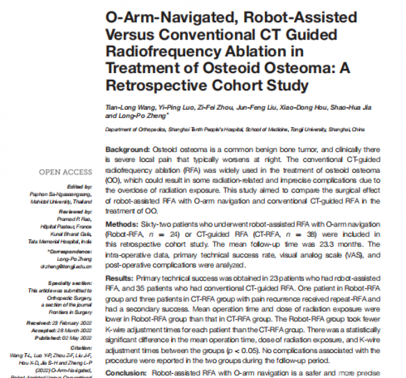 6. Wang, T.-L., et al., O-Arm-Navigated, Robot-Assisted Versus Conventional CT Guided Radiofrequency Ablation in Treatment of Osteoid Osteoma: A Retrospective Cohort Study. Frontiers in Surgery, 2022. 9.