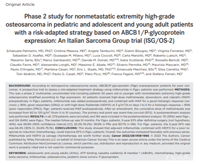 7. Palmerini, E., et al., Phase 2 study for nonmetastatic extremity high-grade osteosarcoma in pediatric and adolescent and young adult patients with a risk-adapted strategy based on ABCB1/P-glycoprotein expression: An Italian Sarcoma Group trial (ISG/OS-2). Cancer, 2022. 128(10): p. 1958-1966.