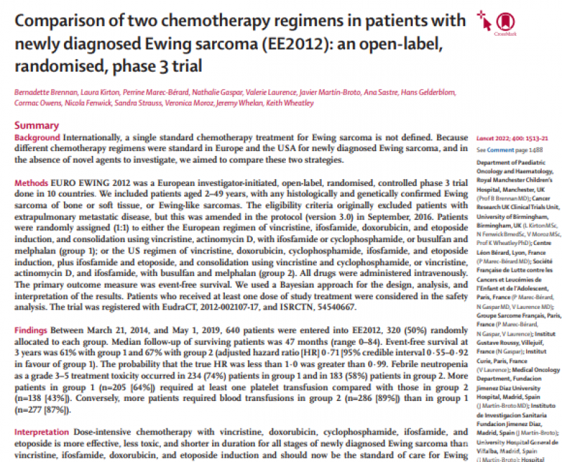 Bernadette Brennan等人通过多中心前瞻性随机对照试验表明长春新碱、多柔比星、环磷酰胺、异环磷酰胺和依托泊苷的剂量强化化疗对于新诊断的尤文肉瘤所有阶段比长春新碱、异环磷酰胺、多柔比星和依托泊苷诱导更有效、毒性更小、持续时间更短。