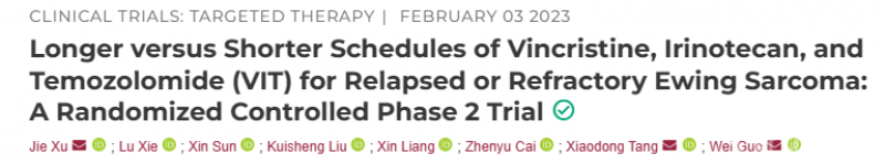 8. Xu, J., et al., Longer versus shorter schedules of vincristine, irinotecan and temozolomide (VIT) for relapsed or refractory Ewing sarcoma: a randomized controlled phase 2 trial. Clinical cancer research : an official journal of the American Association for Cancer Research, 2023.