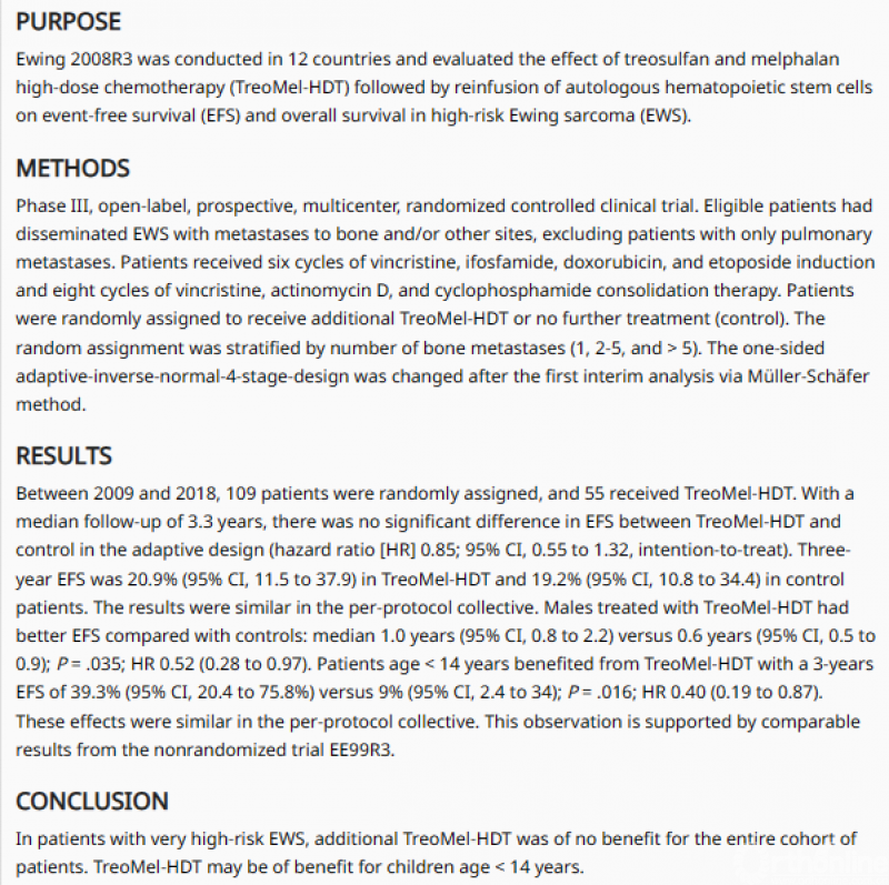 Koch R等人[10]通过前瞻性、多中心的随机对照试验评估了硫丹和美法仑大剂量化疗(TreoMel-HDT)后回输自体造血干细胞对高危尤文肉瘤患者无事件生存期和总生存期的影响,该实验表明在具有极高风险EWS的患者中,额外的硫丹和美法仑大剂量化疗对整个患者队列没有益处,其可能对14岁以下的儿童有益。