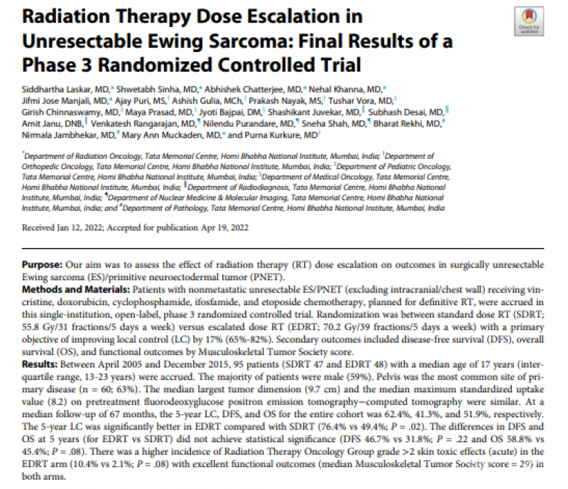 11. Laskar, S., et al., Radiation Therapy Dose Escalation in Unresectable Ewing Sarcoma: Final Results of a Phase 3 Randomized Controlled Trial. International Journal of Radiation Oncology Biology Physics, 2022. 113(5): p. 996-1002.