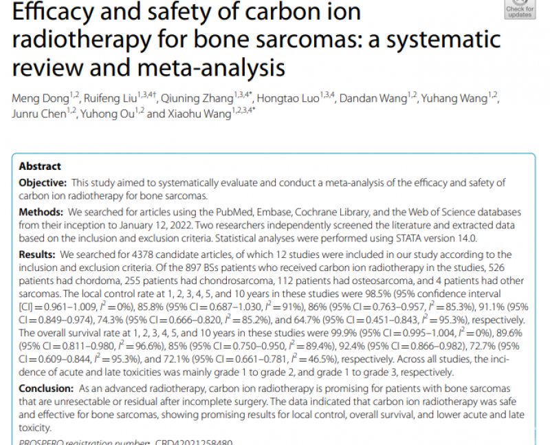 兰州大学团队[12]通过meta分析评估碳离子放疗治疗骨肉瘤的有效性和安全性。共纳入12项研究,共有526例患有脊索瘤,255例患有软骨肉瘤,112例患有骨肉瘤。在这些研究中,1、2、3、4、5和10年的局部控制率分别为98.5%、85.8%、86%、91.1%、74.3%和64.7%。在这些研究中,1、2、3、4、5和10年的总生存率为99.9%、89.6%、85%、92.4%、72.7%和72.1%。结果表明,碳离子放疗对于手术不完全后不可切除或残留的恶性骨肿瘤的治疗是有较大希望的。