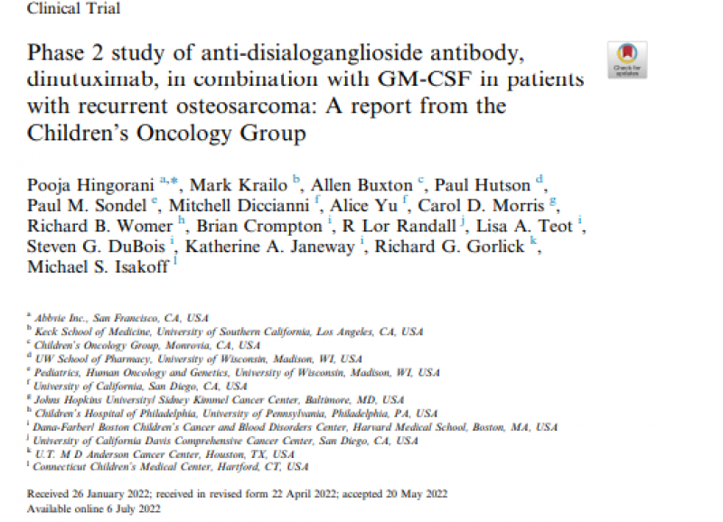 13. Hingorani, P., et al., Phase 2 study of anti-disialoganglioside antibody, dinutuximab, in combination with GM-CSF in patients with recurrent osteosarcoma: A report from the Children?s Oncology Group. European Journal of Cancer, 2022. 172: p. 264-275.