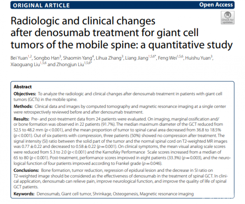 17. Yuan, B., et al., Radiologic and clinical changes after denosumab treatment for giant cell tumors of the mobile spine: a quantitative study. Insights into Imaging, 2022. 13(1).