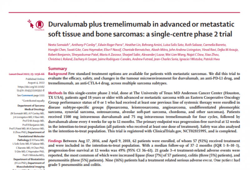 19. Somaiah, N., et al., Durvalumab plus tremelimumab in advanced or metastatic soft tissue and bone sarcomas: a single-centre phase 2 trial. Lancet Oncology, 2022. 23(9): p. 1156-1166.
