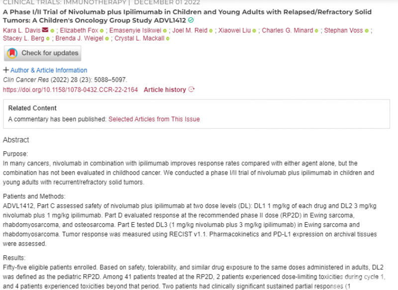 20. Davis, K.L., et al., A Phase I/II Trial of Nivolumab plus Ipilimumab in Children and Young Adults with Relapsed/Refractory Solid Tumors: A Children?s Oncology Group Study ADVL1412 br. Clinical Cancer Research, 2022. 28(23): p. 5088-5097.