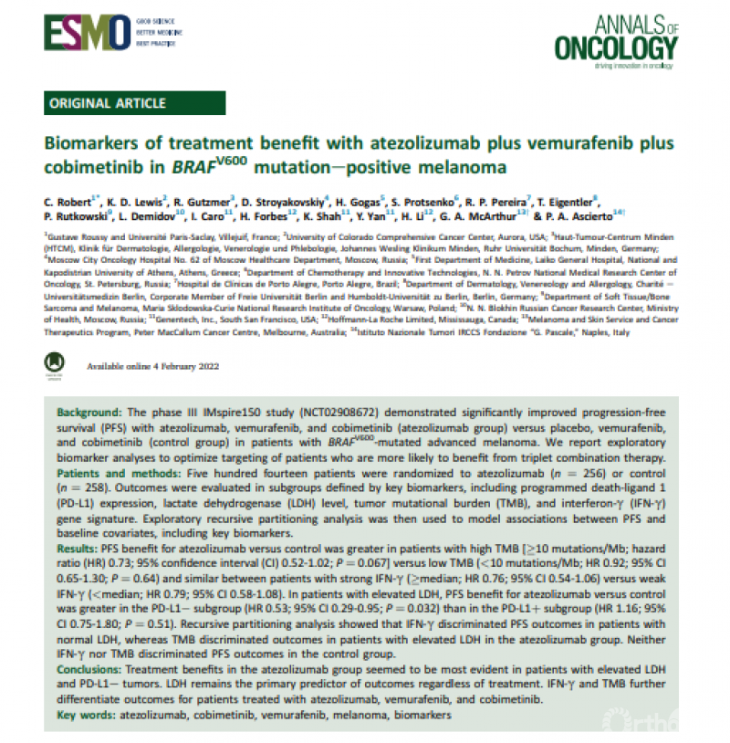 22. Robert, C., et al., Biomarkers of treatment benefit with atezolizumab plus vemurafenib plus cobimetinib in BRAF(V600) mutation-positive melanoma. Annals of Oncology, 2022. 33(5): p. 544-555.