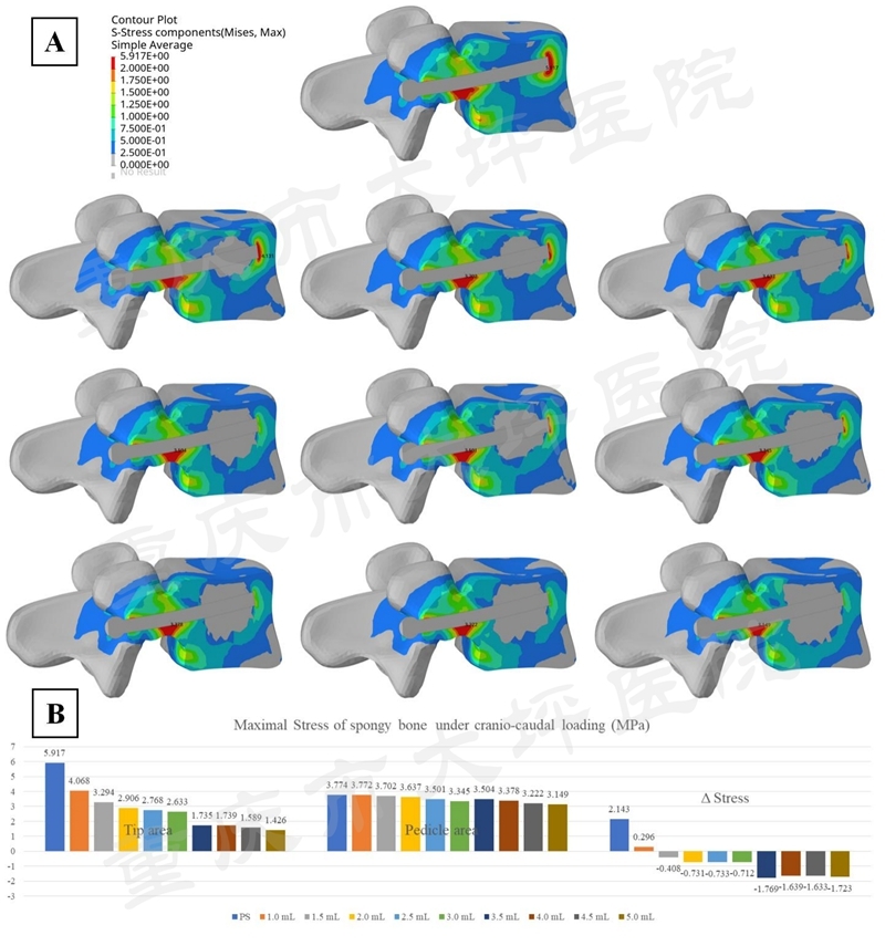 定量数据表明,使用1.5ml骨水泥时椎弓根部应力开始大于骨水泥-螺钉复合体,使用3.5ml骨水泥时椎弓根部应力显著增加(图4)。该结果的临床指导意义在于,PMMA螺钉最佳骨水泥用量可能为1.5-3ml。
