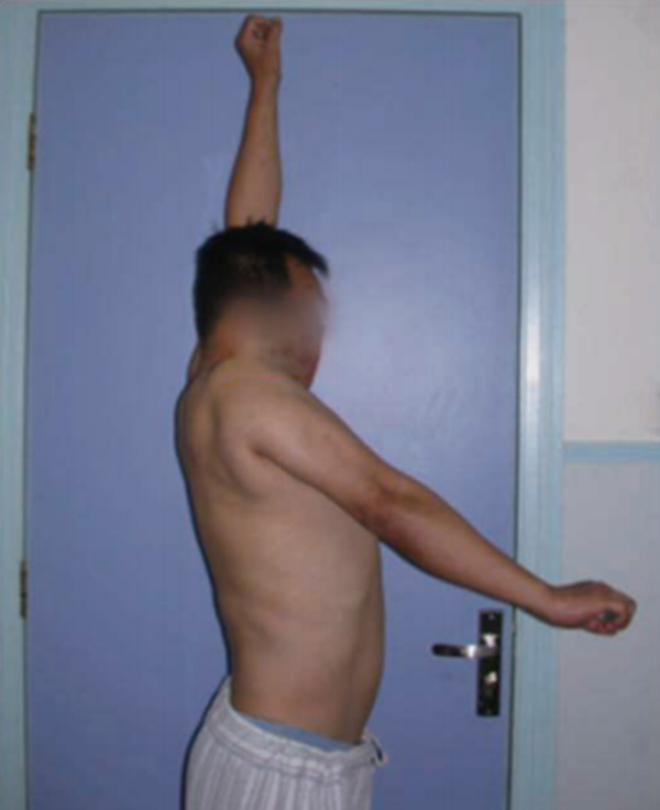 肩关节活动度包括前屈上举、体侧外旋、体侧内旋,这3个方向的活动度能基本代表肩关节各向的活动度。活动度检查应该包括主动活动度和被动活动度检查,并将患侧和健侧进行对比。