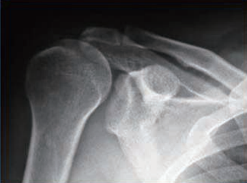 图5 巨大肩袖损伤时肱骨头上移X线影像