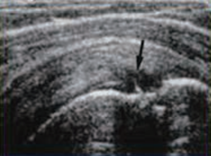 图7 B超显示肩袖全层损伤(箭头)