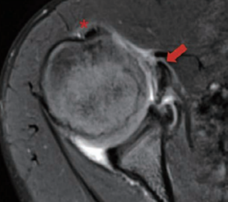 横断位MRI可以辅助判断肩胛下肌、冈下肌及小圆肌的损伤情况。在MRI上观察到肱二头肌长头腱半脱位或脱位的情况,应该高度怀疑肩胛下肌腱的部分或全层撕裂。这些病变一般在T2像上更容易分辨(图9)。