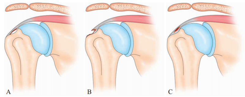 图10 肩袖部分损伤 A.关节面部分撕裂;B.滑囊面部分撕裂;C.肌腱内部分撕裂