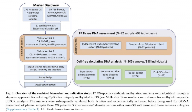 英国皇家国立骨科医院针对此进行研究,其目的是发现和验证骨肉瘤的甲基化生物标志物,检测OS患者血浆ctDNA,并探索其作为预后标志物的效用。