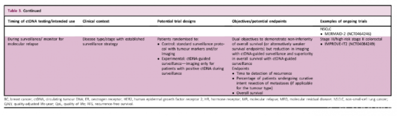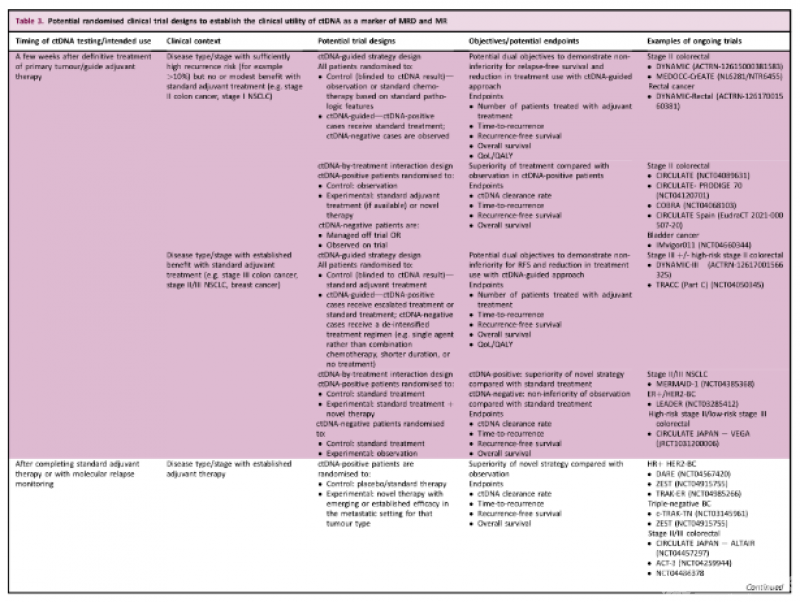 目前正在进行多个基于ctDNA的随机临床试验,以确定ctDNA在早期实体肿瘤中的临床效用。一般来说,ctDNA引导的试验可以在以下临床环境中进行(表3)。