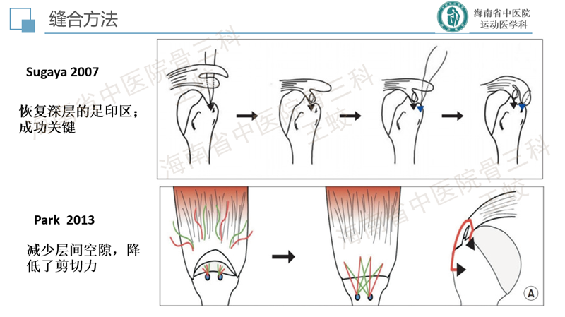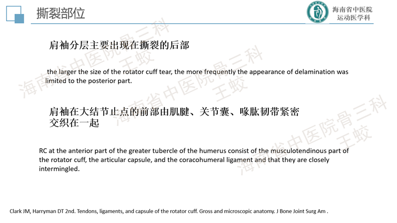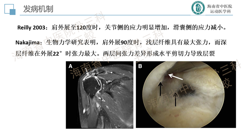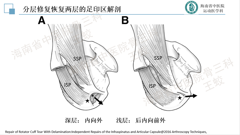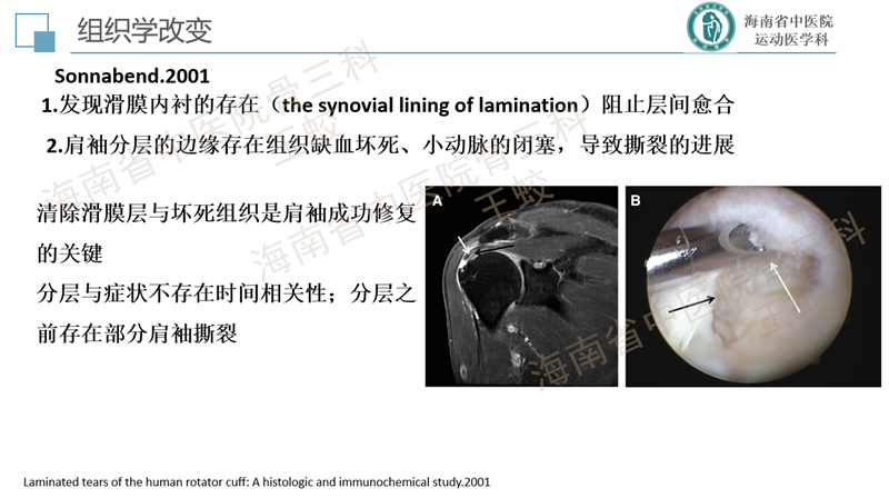 肩袖分层撕裂是肩袖的一种慢性退变性疾病,类似于膝关节内侧半月板后角的退变性层裂,患者往往肩痛症状较重,持续时间较长,预后较差。目前发病机制尚不十分明确,研究较少。缝合方法也没有达成共识,恢复肩袖的完整性,保持层间的张力是临床上需要重点关注的问题。