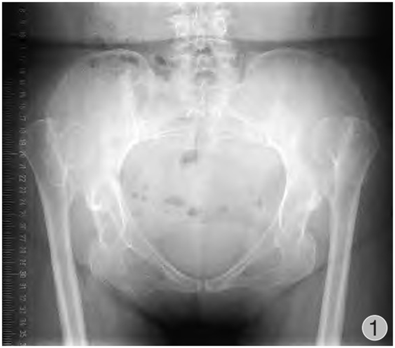 图1 术前骨盆正位DR:双侧CROWE Ⅳ型DDH,股骨头脱位高度>股骨头高度的100%。双侧均无假臼形成;真臼未能正常发育,髋臼浅小;股骨头小、不规则;股骨颈短,颈干角减小,偏心距减小,股骨近端骨皮质变薄,髓腔窄小变直,呈柱状,髓腔峡部位置相比正常股骨较高