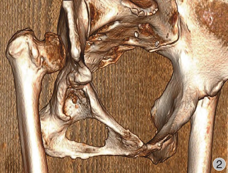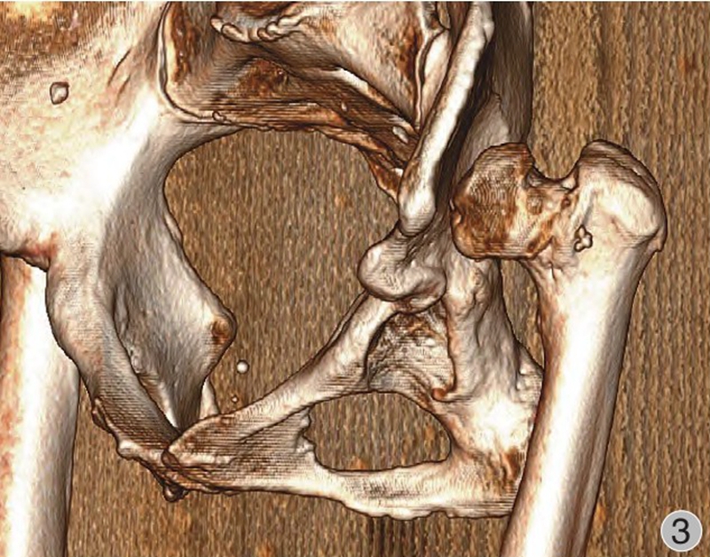 图2 术前髋关节CT三维重建(右侧观):股骨头脱位高度>股骨头高度的100%,真臼未能正常发育,髋臼浅小呈三角形,前倾增大,前后柱骨质丰厚,无大量骨缺损;右侧股骨头小,股骨颈短,颈干角、偏心距减小,股骨头与髂骨翼未形成假臼,股骨近端骨皮质变薄,髓腔窄小变直,呈柱状