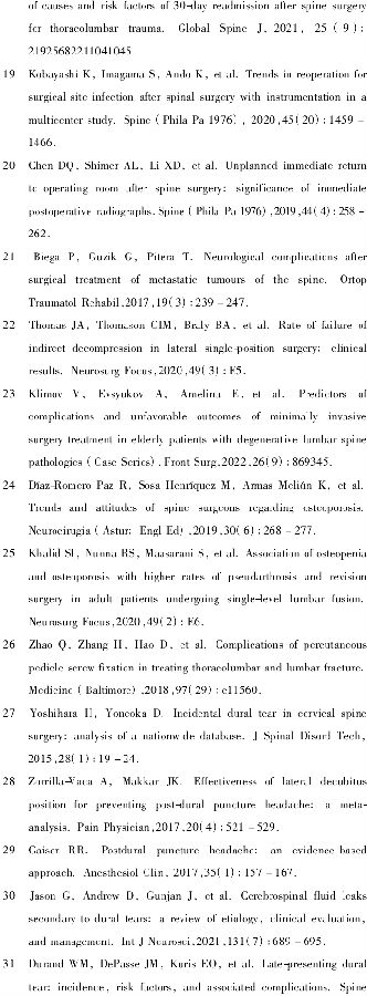 在一项35246例脊柱手术的研究中[4],297例(0.84%)需要在脊柱手术后30d内进行UPR,其中胸椎疾病(3.23%)、脊柱肿瘤(1.63%)、脊柱畸形(1.50%)的再手术率高于寰枢椎(0.61%)、颈椎(0.65%)和腰椎(0.82%)退行性疾病。再次手术的常见原因包括硬膜外血肿(0.403%)、切口感染(0.148%)、神经功能缺损(0.108%)和椎弓根螺钉错位(0.077%)。