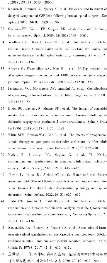 Kevin等[40]回顾性分析2005~2013年12641例因腰椎退行性病变行腰椎融合术,30、90d再手术率分别为1.8%、4.2%,与90d再手术相关的变量有长节段融合、住院时间>7d、药物滥用、骨质疏松和抑郁。手术时间延长是30d内再次手术的唯一独立因素[41],其他因素如术前诊断、BMI、美国麻醉医师协会分级、糖尿病。静脉血栓形成是腰椎手术后再入院、再手术和死亡的公认的和可预防的原因之一,术后30d静脉血栓形成发生率为2.47%(170/6882)[6]。