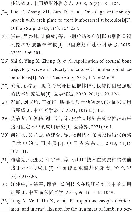 目前,普遍认为腰骶椎结核后路手术具有风险小、手术时间短、出血量小等优势,但仍有研究者选择前路手术进行腰骶椎结核的病灶清除。