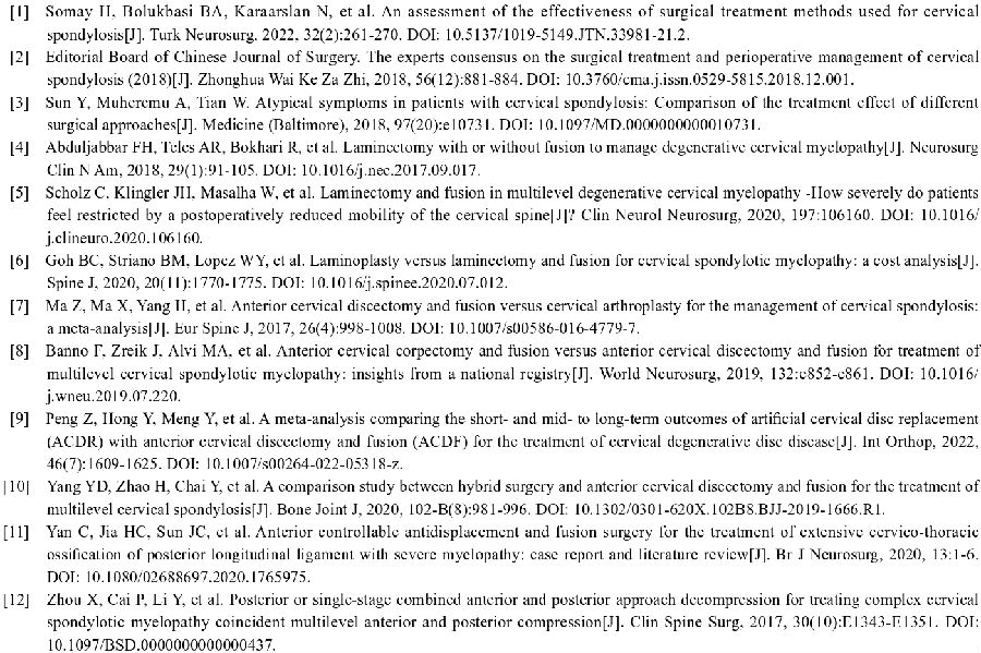 2. 颈椎病手术治疗方法较为复杂而且存在一定风险,手术医师应具备扎实的脊柱外科手术操作技能,严格掌握手术指征,严格遵循手术操作规范。
