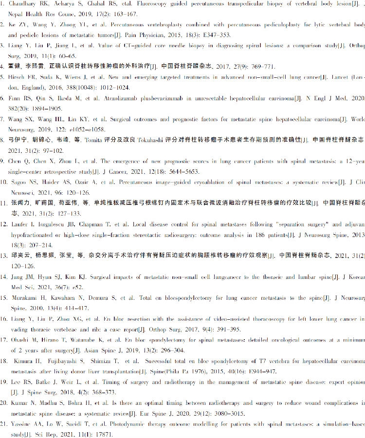 对于一些患者也可以尝试射频、微波消融、放射性粒子植入术等治疗[10]。张闻力等[11]通过术中对脊柱转移瘤射频消融后再切除,结果提示这一方法与椎板减压内固定相比,术后短期可更好地控制疼痛,具有更长的无病进展期,更少的出血量,但仍然需警惕由于操作不当而产生的神经损伤。