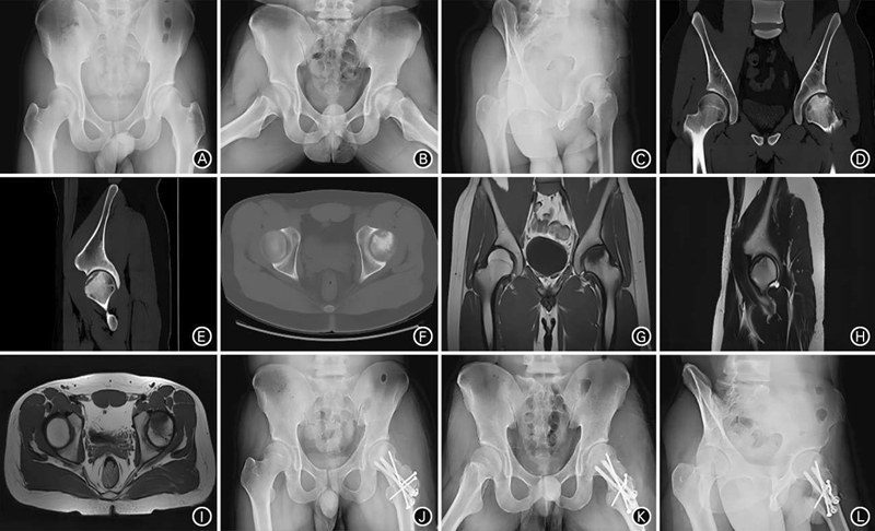 图2 患者男,22岁,训练伤致左髋疼痛1年入院,诊断为SIFFH,行保留圆韧带的股骨颈旋转截骨术。A、B.术前双髋关节正位、蛙式位X线片示左侧股骨头负重区密度降低,软骨下明显骨折;C~D.术前左髋关节65°斜位X线片示髋关节前侧覆盖良好;D~F.术前双髋关节冠状位、矢状位及水平位CT示骨折累及股骨头前1/3;G~I.术前双髋关节冠状位、左侧单髋关节矢状位、双髋关节水平位MRI T1加权像示股骨头骨折累及股骨头前1/3;J、K.术后1年双髋关节正位、蛙式位X线片示股骨颈及大转子处截骨后愈合良好,内固定物位置良好;L.术后1年左髋关节65°斜位X线片示股骨头覆盖良好。注:SIFFH为股骨头软骨下骨折