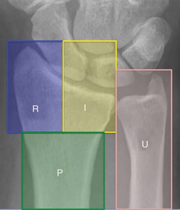 图1 前后位X线显示尺桡骨远端三柱结构,R为桡侧柱,I为中柱,U为尺侧柱,P为桡骨远端基底干骺端