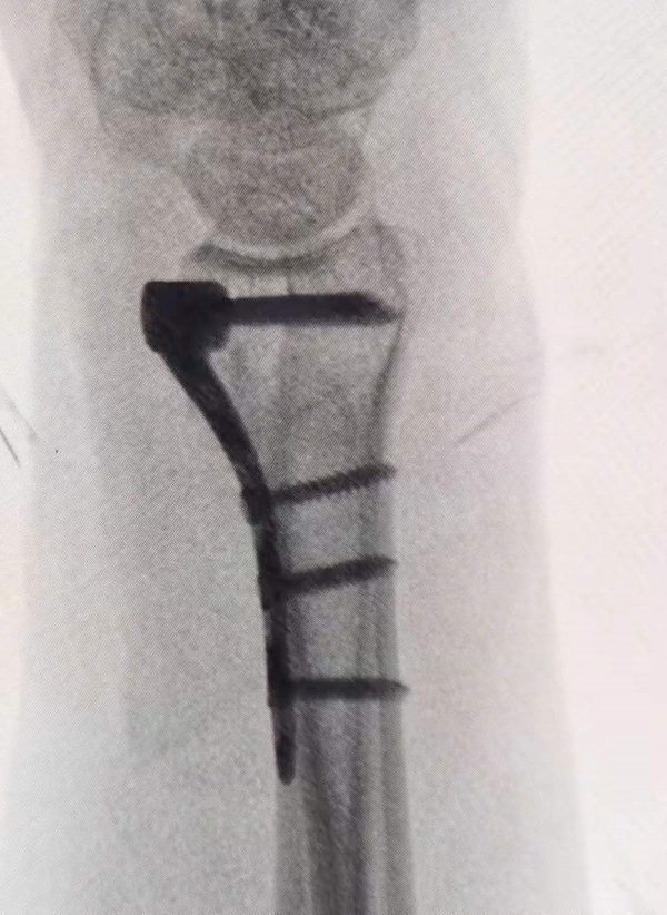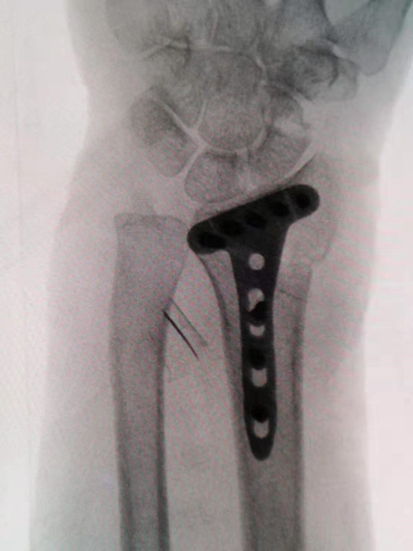 C臂再次透视下确保骨折复位达到相关指标、内固定位置良好后打入剩余螺钉。术中除常规正侧位透视外需增加背侧切线位透视,以确保螺钉长度合适。