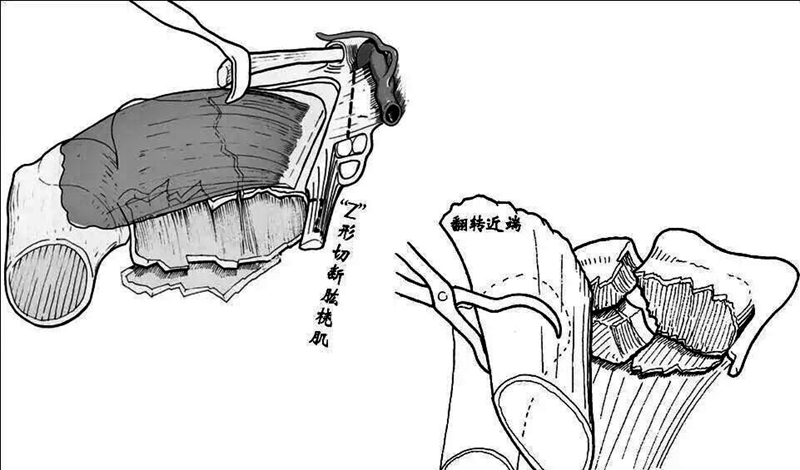 C、显露要充分,切口要尽量靠近远端,超过腕横纹;我们的经验是切口经过腕横纹时,增加一个锯齿切口,以防止腕部形成索状疤痕。