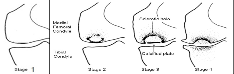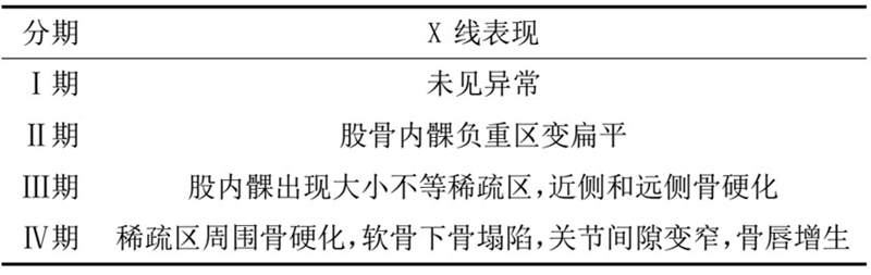 目前SONK诊断最常用的分期方法是1979年Koshino提出的分期法。Koshino分期基于临床和影像学的结果,将SONK分为四个阶段: