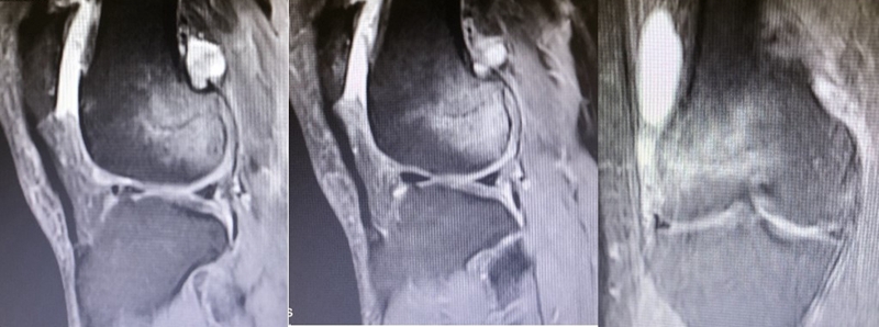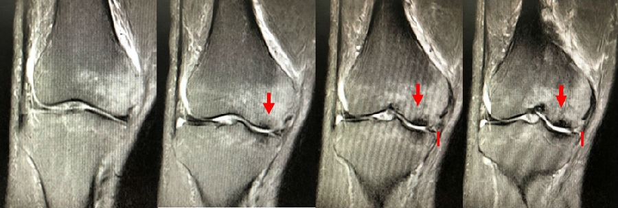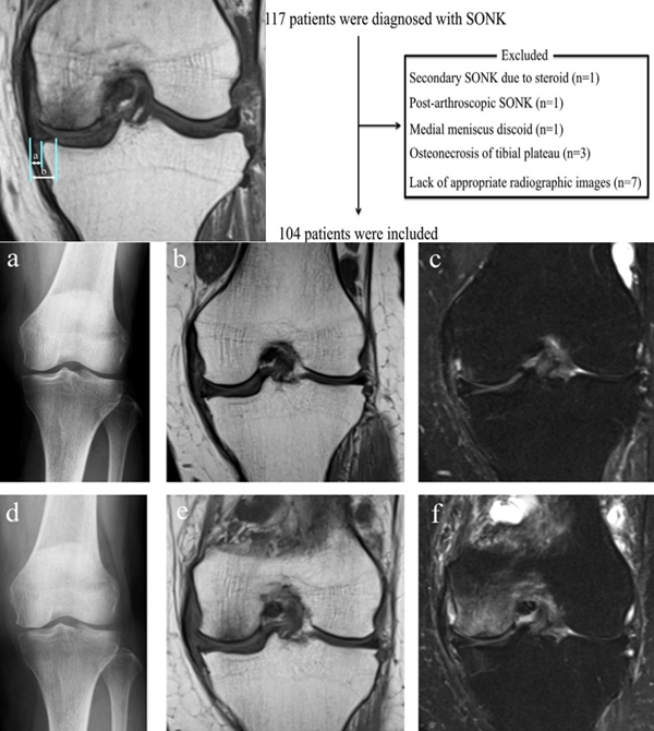 SONK与内侧半月板突出的相关研究中,100%(104)SONK中都有半月板突出,4个SONK在发病前因膝关节疼痛体检发现半月板突出,几个月后通过MRI检查显示存在 SONK。