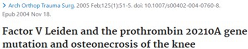 另一项结果中,32例患者的因子ⅤLeiden和凝血酶原20210A基因发生率更高。这两种基因突变会引起凝血功能异常而更容易形成血栓,造成膝关节软骨下骨循环障碍而出现坏死。
