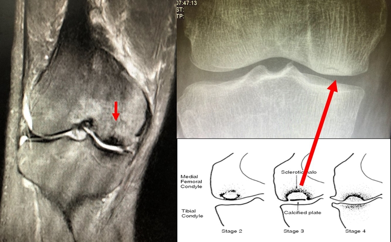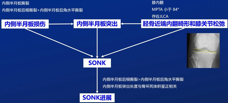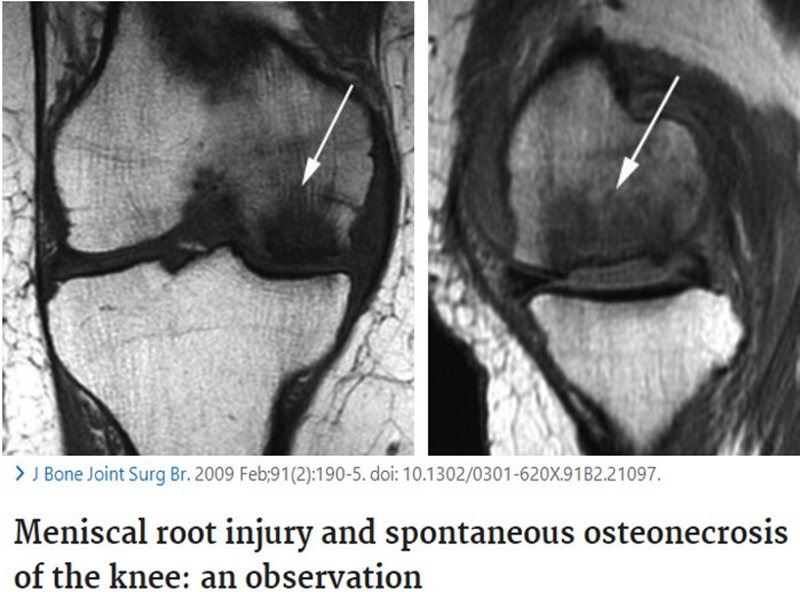 SONK与内侧半月板后根部损伤,有国外学者在SONK患者中通过MRI及关节镜检查,常可发现合并内侧半月板后根部的撕裂,该发生率可达到80%(24/30), 15例完全撕裂,9例部分撕裂。结果表明SONK可能与内侧半月板后根部撕裂后,导致股骨负重区的应力集中、软骨下骨髓水肿有关。