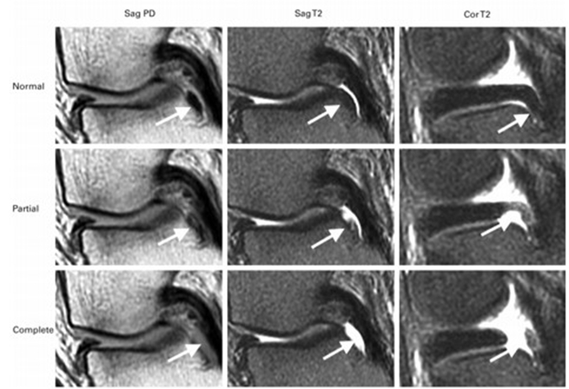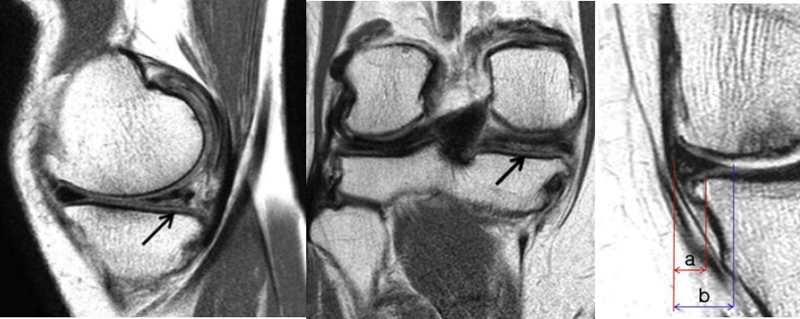 与内侧半月板后角水平撕裂相比,后根撕裂将导致更大程度的突出和更广泛的骨坏死。
