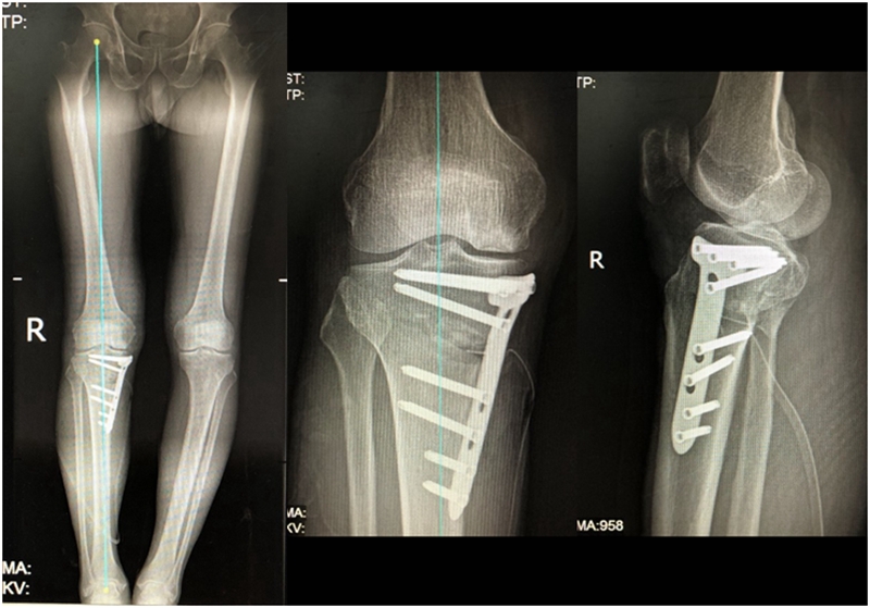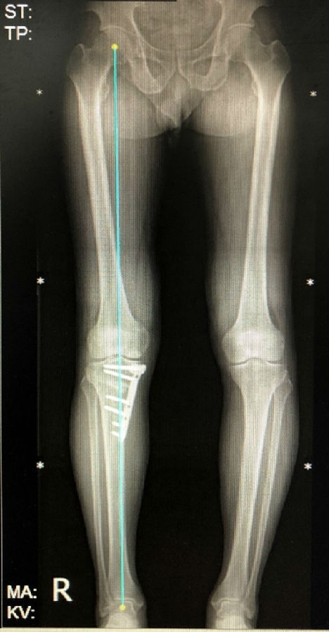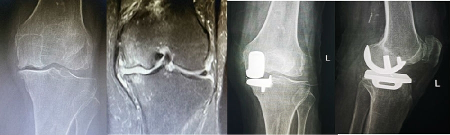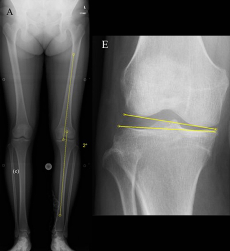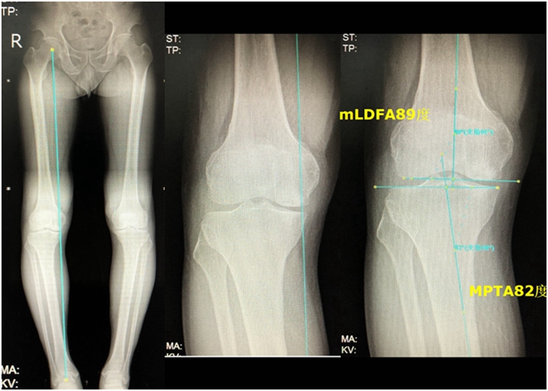 病例1:男,64岁,主诉左膝关节内侧疼痛6年余。MR提示骨坏死区占比为33.28%,矢状位病变区域前后径为26.42mm,半月板相对突出百分比(RPE)31.78%,同时存在胫骨侧来源的下肢内翻畸形(MPTA83°),关节线会聚角2°。