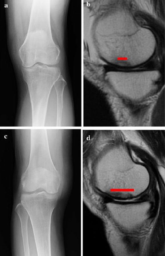 a.患者,59岁女性,AP侧位片显示SONKⅠ期,FTA<180°;b.MRI T2显示病变深度<20mm,患者出现症状1年后保守治疗;c.75岁女性,X线显示SONKⅠ期,FTA>180°;d. MRI T2显示病变深度>20mm,患者于症状出现后11周行手术治疗
